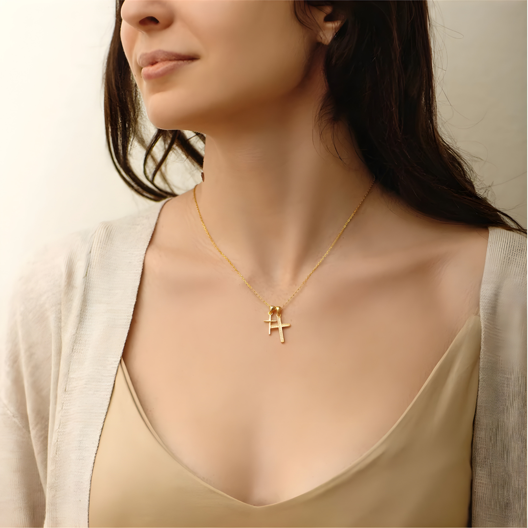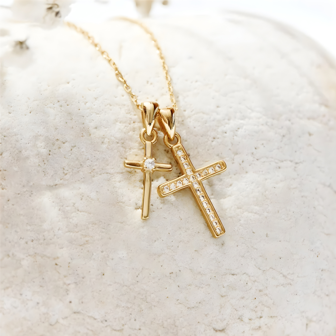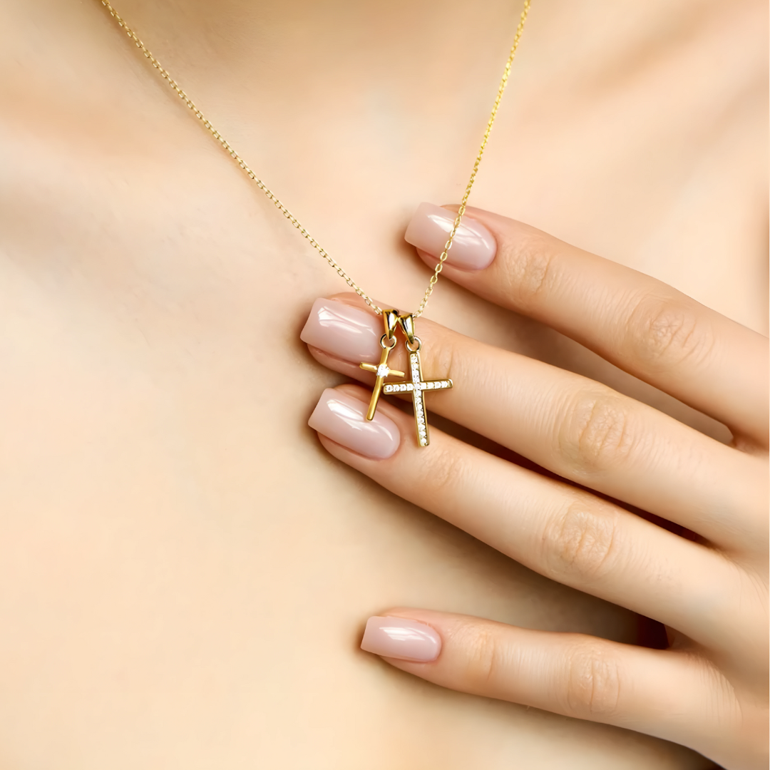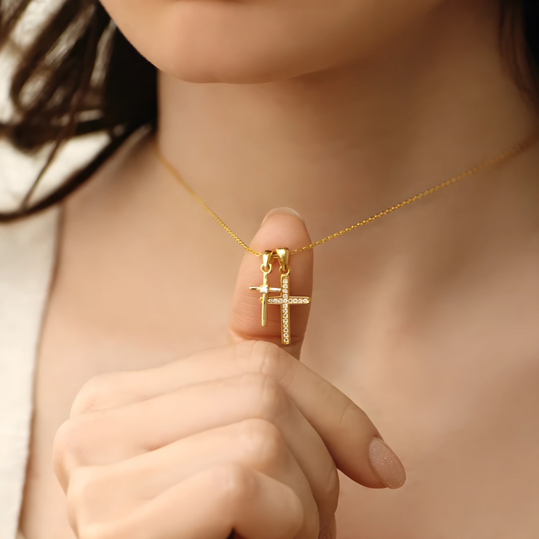 Un collar que no solo adorna — acompaña. Cada vez que lo toques, recuerda: Él tiene el control. Plata de ley 925, acabado en oro de 18K, circonita cúbica AAA.