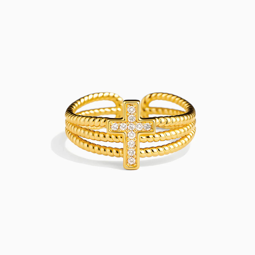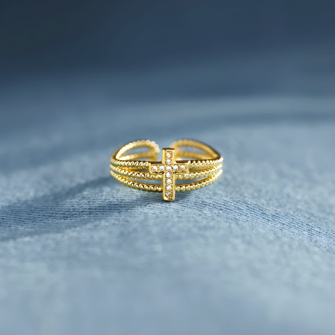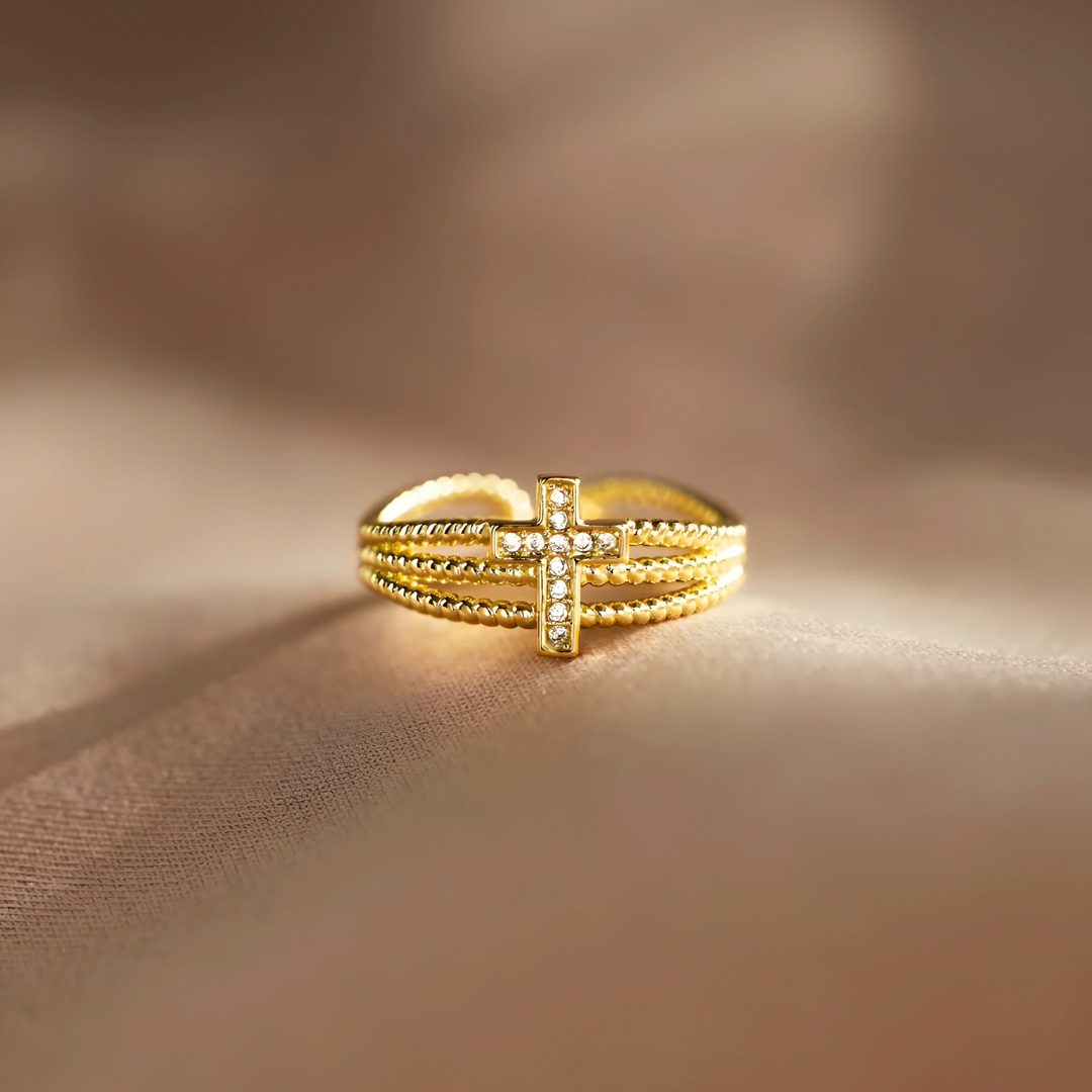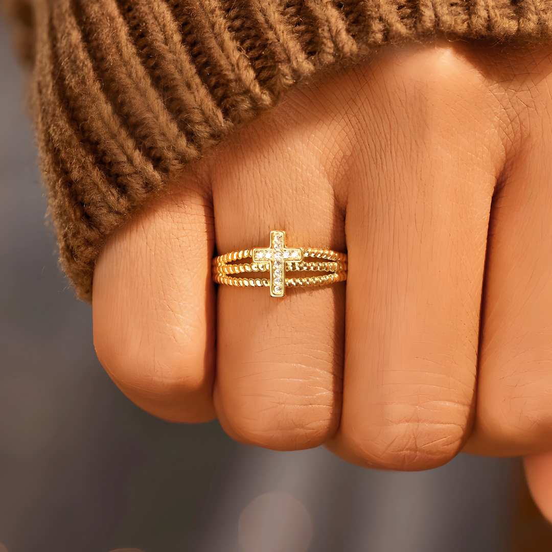 Una cruz que brilla. Unas bandas que abrazan. Plata de ley 925 bañada en oro de 18K con circonita cúbica AAA — cada detalle del Anillo Protección Divina dice lo mismo: estás protegida.